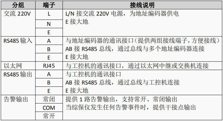 地址編碼器與保護開關直接連接,采集保護開關的報警信息;綜保儀通過 RS485 總線采集 多個地址編碼器的報警信息,實時顯示并存儲地址編碼器的報警信息;工控機通過以太網 /RS485 接口采集多臺綜保儀連接的保護開關的信息,并通過皮帶進行邏輯編組,提供統一的 管理和查看界面。