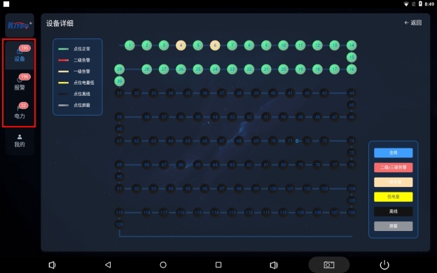 設(shè)備詳情頁實(shí)時(shí)顯示皮帶上保護(hù)裝置當(dāng)前狀態(tài)鏈路圖,分為6種樣色顯示,分別代表保護(hù)裝置正常,保護(hù)裝置保護(hù)裝置二級(jí)告警,保護(hù)裝置一級(jí)告警,保護(hù)裝置電量低,保護(hù)裝置離線,保護(hù)裝置屏蔽六種狀態(tài)。