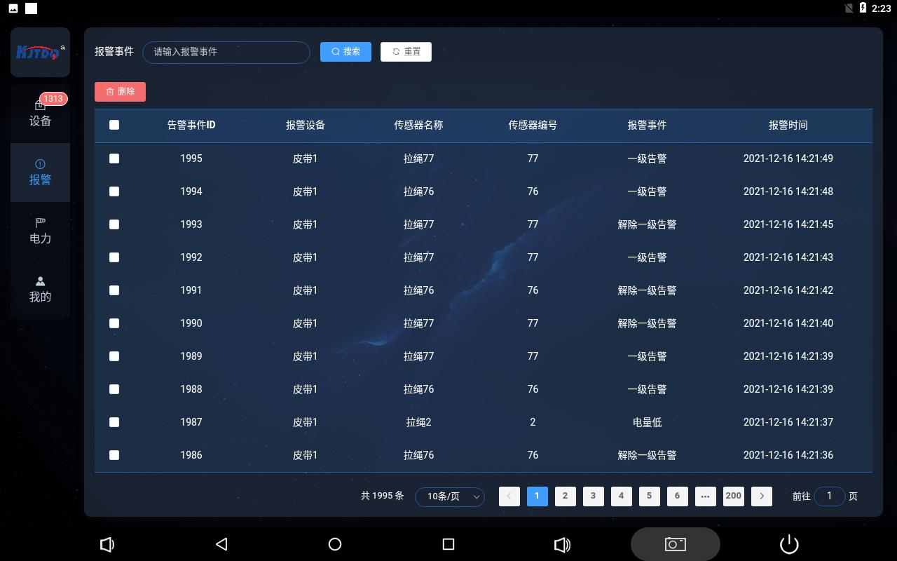 報(bào)警頁面實(shí)時(shí)刷新紀(jì)錄報(bào)警事件,記錄對(duì)應(yīng)皮帶上的對(duì)應(yīng)地址號(hào)的保護(hù)設(shè)備的報(bào)警信息和發(fā)生時(shí)間,報(bào)警記錄的信息為保護(hù)裝置上線、下線、電量低、一級(jí)、二級(jí)告警、一級(jí)、二級(jí)告警解除。
