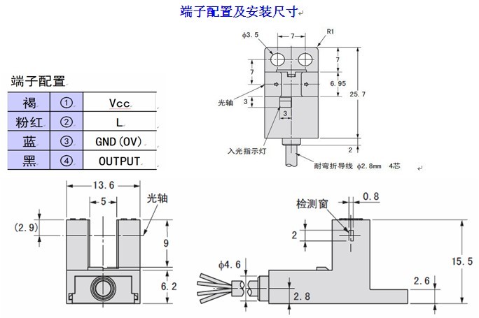 ● “L”引線與“+”引線相接時(shí),輸出狀態(tài)即時(shí)轉(zhuǎn)換如:設(shè)傳感器現(xiàn)態(tài)為受光時(shí)指示燈亮、“out”沒有輸出電流,相接后指示燈仍亮、但“out”有輸出電流。其它各引腳接線錯(cuò)誤時(shí),傳感器不工作,但傳感器本身不會損壞;